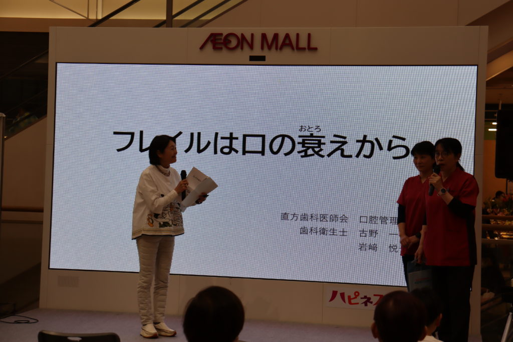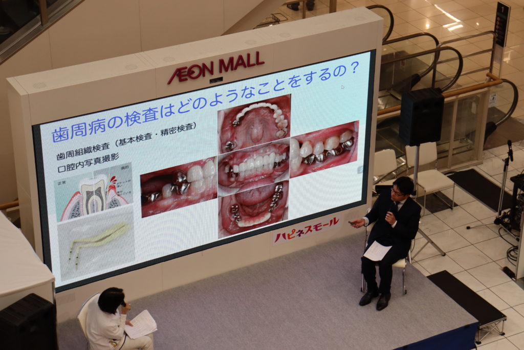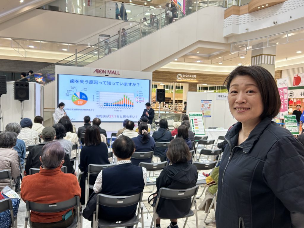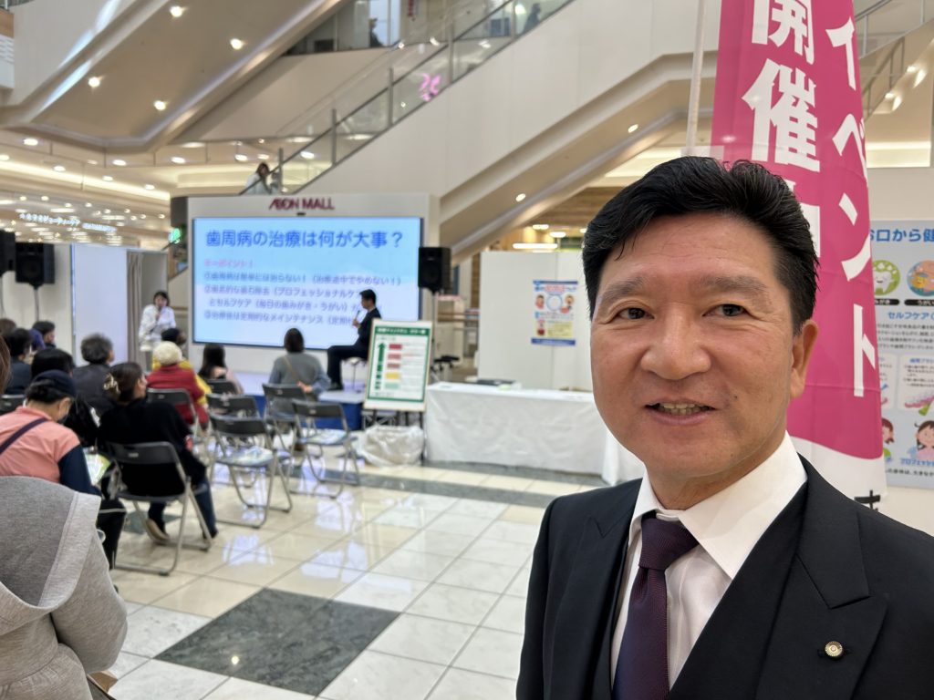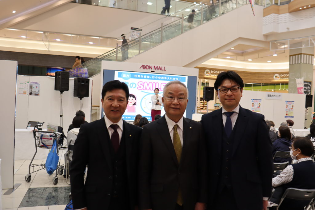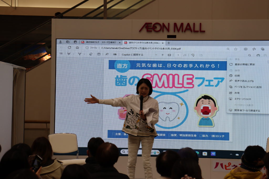 3月10日イオンモール直方1Fリリーコートにて歯のSMILEフェアが開催されました。直方歯科医師会から歯の健康に関するトークショーで白土徹先生、推進室の古野歯科衛生士が登壇し、一般市民向けの活動を行いました。