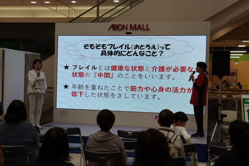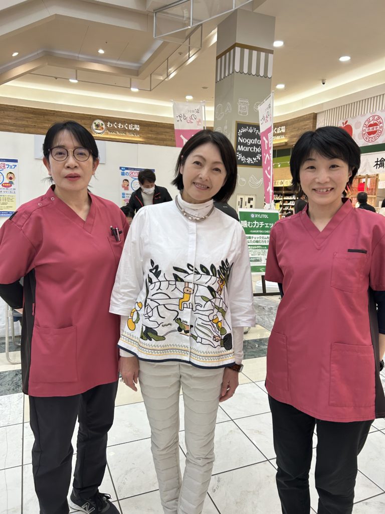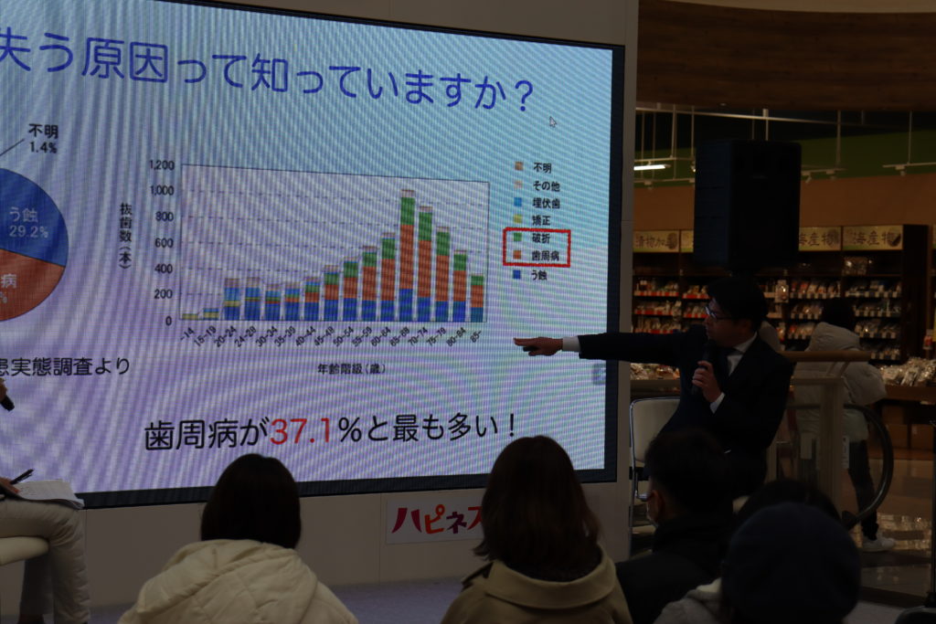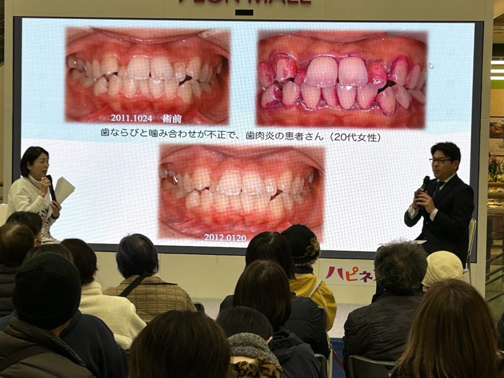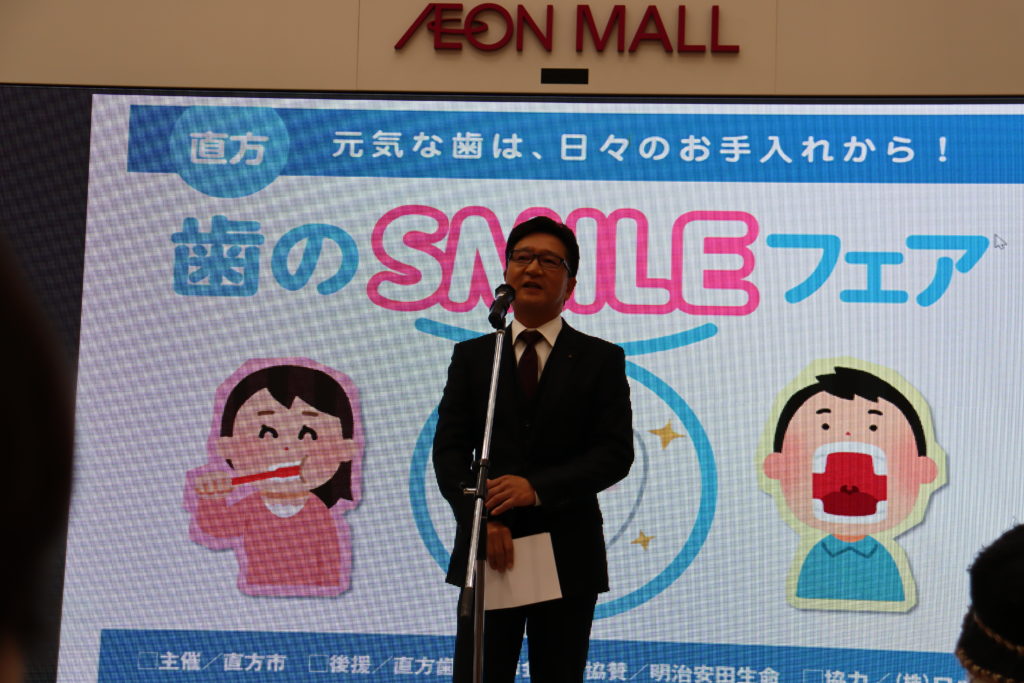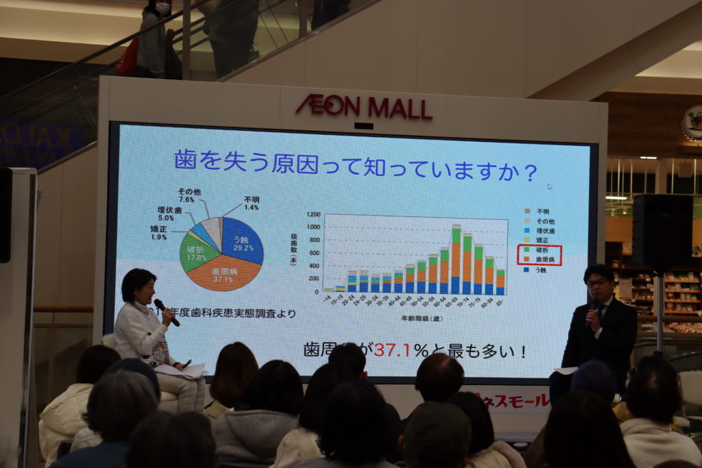3月10日イオンモール直方1Fリリーコートにて歯のSMILEフェアが開催されました。直方歯科医師会から歯の健康に関するトークショーで白土徹先生、推進室の古野歯科衛生士が登壇し、一般市民向けの活動を行いました。